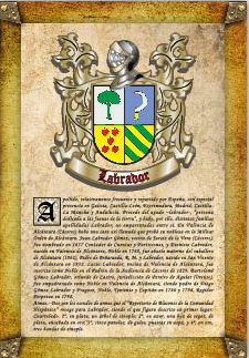 Ahora les voy hablar acerca del escudo LABRADOR, es impoprtante entender que los escudos no pertencen a los apellidos como tal, sino a las personas y las familias (tambien las instituciones), las que adoptan o heredan un blasón. Es decir, no todos los LABRADOR tienen el mismo escudo, ya que existen el mismo apellido con diferentes origenes.